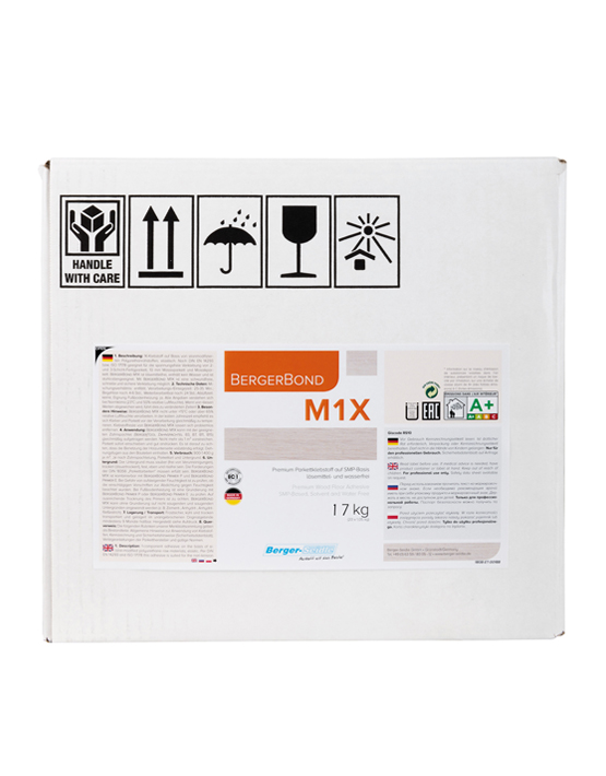 BergerBond M1X nicht unter +15°C oder über 65% relativer Luftfeuchte verarbeiten. In der kalten Jahreszeit empfiehlt es sich, Kleber und Parkett vor der Verarbeitung gleichmäßig zu temperieren. Klebstoffreste von BergerBond M1X lassen sich problemlos entfernen.