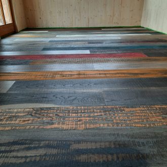 Oberfläche gekälkt ,schwarz Hartwachsgeölt, gealterte Oberfläche teilweise offene Risse,Fussbodenheizung geeignet.