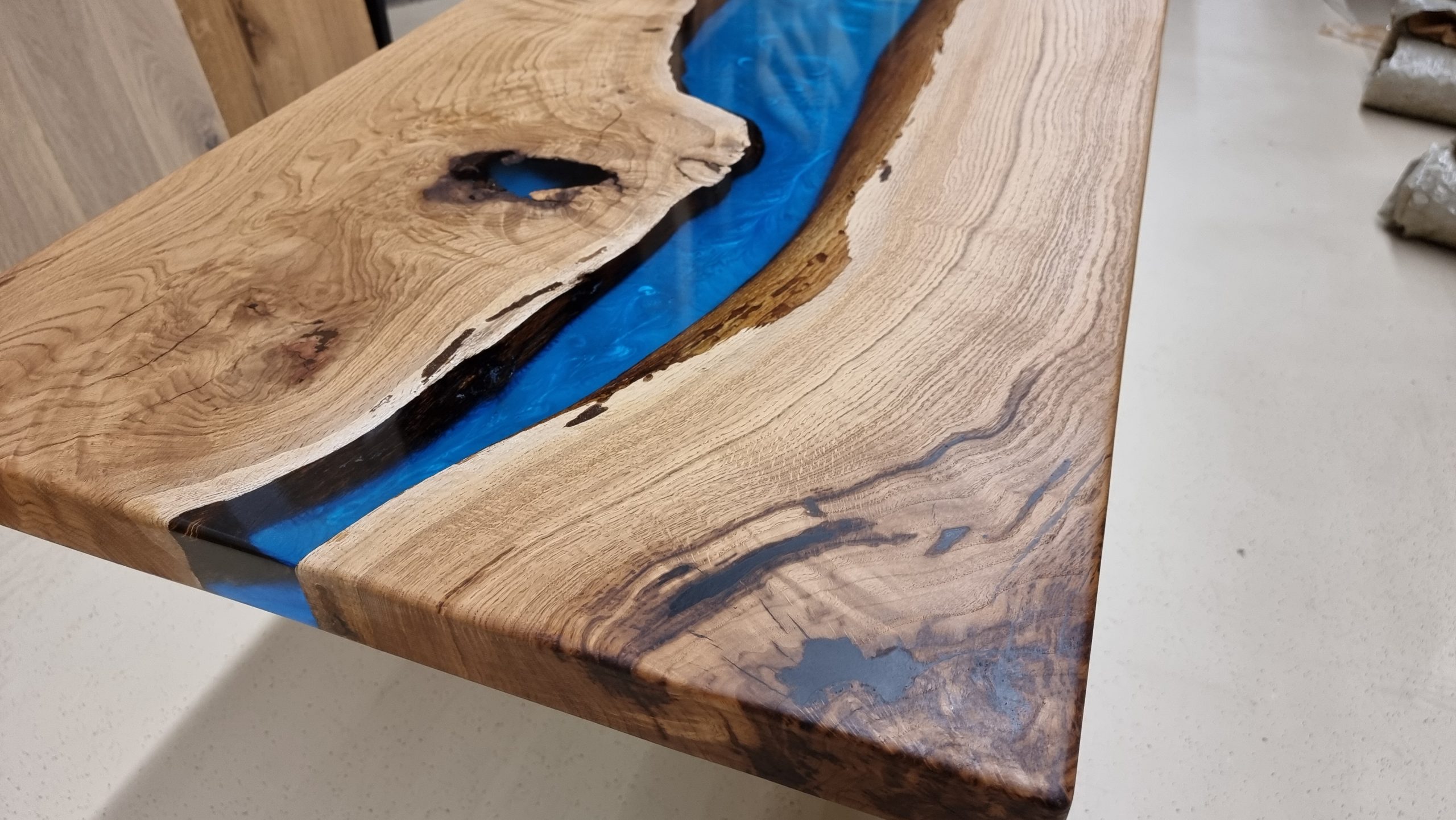 Epoxyharztisch aus Eiche , von Hand angefertigt,Transparantes glänzendes nachtblaues Epoxidharz